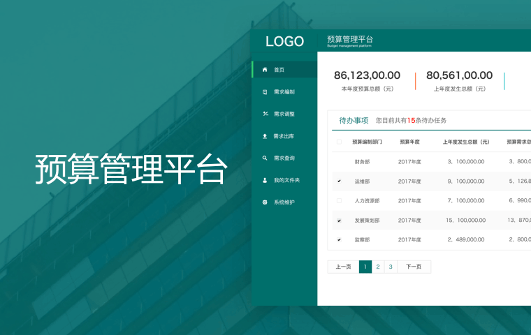 预算需求管理平台由首页、需求编制、需求调整、需求上报、需求查询、我的文件夹、系统维护7部分构成